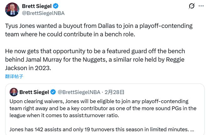 名记Siegel跟进报道称,琼斯与独行侠达成买断,是想加盟一支具备季后赛竞争力的球队,并在球队中担任替补贡献者。如今他得到了这样的机会 —— 将在掘金担任贾马尔-穆雷身后的主要替补后卫,这与2023年雷吉-杰克逊在掘金的角色相似。