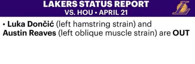 北京时间4月21日,洛杉矶湖人官方发布了季后赛首轮第二场他们主场迎战休斯顿火箭的伤情报告,卢卡-东契奇和奥斯丁-里夫斯将继续因伤缺阵。