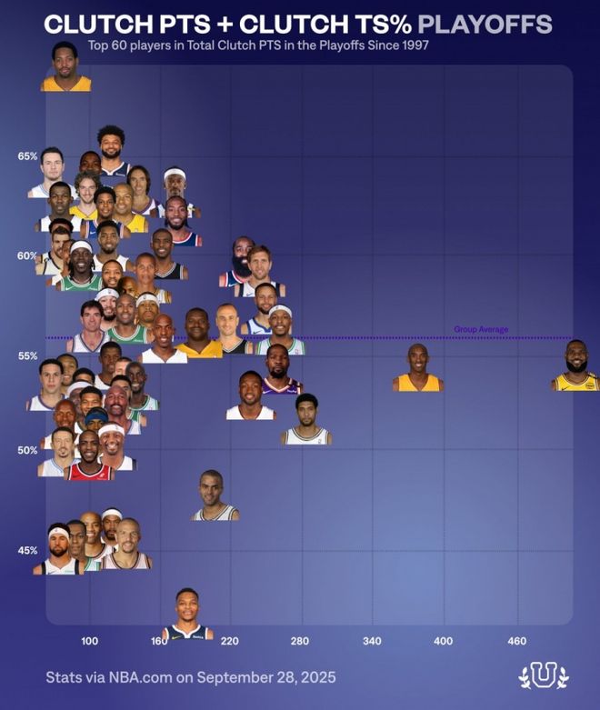 9月29日。有著名媒体NBA University统计并公布了从NBA官方有数据统计的1997年至今,在季后赛关键时刻(这有传统标准:最后5分钟分差在5分以内)得分表现(包括得分和效率)同期前六十的