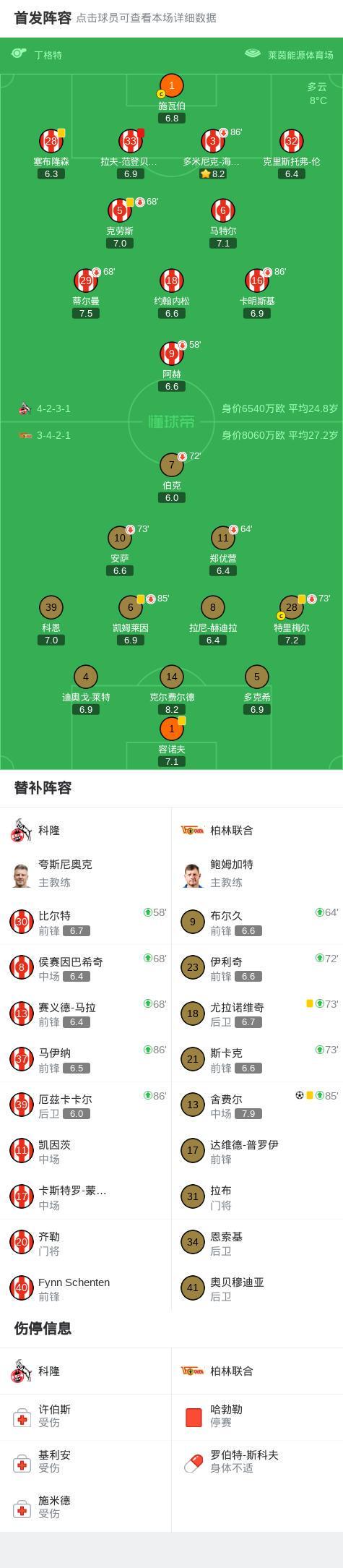 北京时间12月20日,德国足球甲级联赛第15轮,科隆主场迎战柏林联合。比赛中,科隆球员拉夫-范登贝尔赫被红牌罚下。补时阶段,柏林联合球员舍费尔攻入全场唯一进球。最终,柏林联合以1比0战胜科隆。