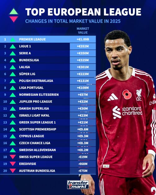 在2025年,英超市场价值增长了10.9亿欧元,达到了125亿欧元,继续成为世界足坛最有价值联赛,也成为2025年市场价值增幅最大的联赛。