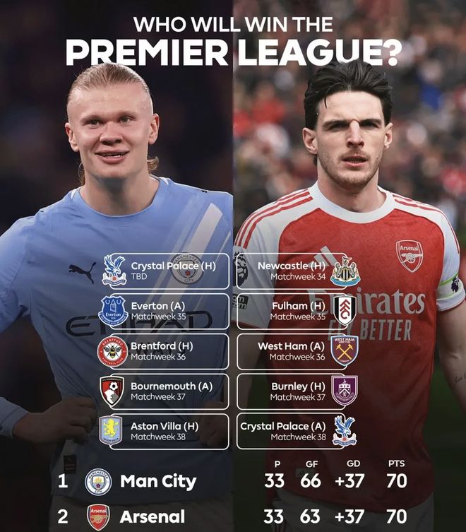 在英超积分榜上,目前曼城、阿森纳同积70分,净胜球均为27个,曼城的进球数比阿森纳多3个,曼城反超阿森纳来到英超第1位。在本赛季剩余的英超比赛中,曼城的对手包括水晶宫、埃弗顿、布伦特福德、伯恩茅斯以及维拉,而阿森纳要踢纽卡、富勒姆、西汉姆联、伯恩利以及水晶宫。曼城还有足总杯半决赛任务,对手是英冠的南安普顿,枪手要在欧冠半决赛中跟马竞进行两回合消耗战。
